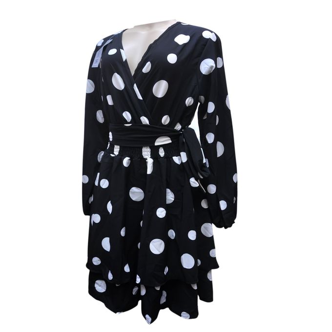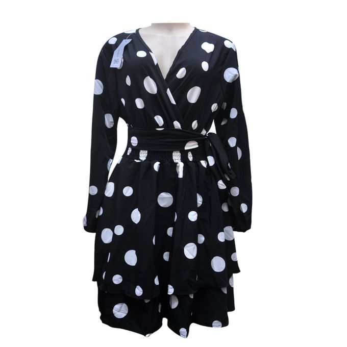 The dress is made of good material. It has a tie-waist belt that also has additional details to the dress. It has an amazing polka-dot print that makes it stand out. The long sleeves are elastic at the wrists and this helps put them in place.