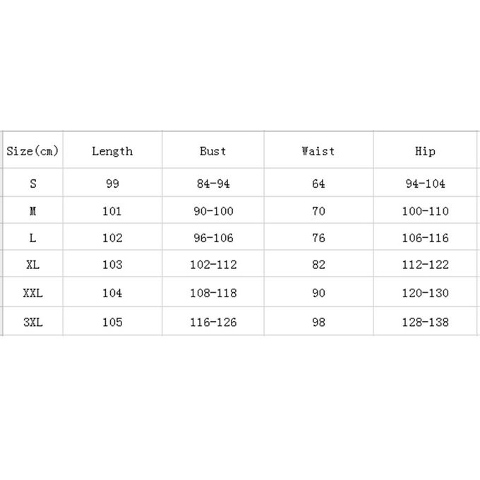 108-118cm; Waist: 90cm; Hip:120-130cm Size 3XL, Length:105cm ;Bust: